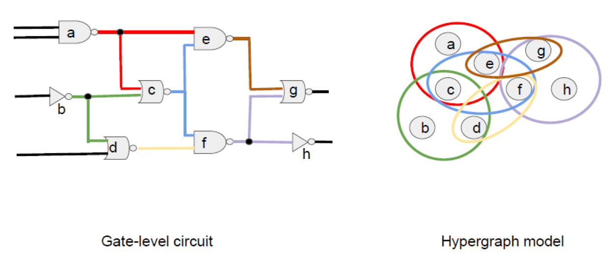 What’s the connection between EDA and graph algorithms? The key observation is that circuits can be viewed abstractly as graphs or hyper-graphs. The gate-level circuit shown above can be viewed as a graph in which nodes represent gates and edges represent wires between gates. In some problems, it is more useful to view the circuit as a hyper-graph in which all the wires connected the output of a gate are considered to be a single hyper-edge; in the circuit shown above, the output of gate “a” is connected to the inputs of gates “e” and “c”, so there is a hyper-edge connecting nodes {a,c,e} in the abstraction.