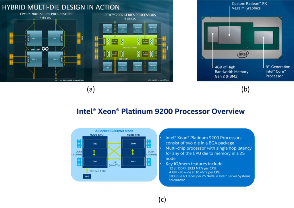Figure 2. Recent commercialized products employing MCM technology: (a) AMD’s Epyc Rome, (b) Intel’s Core i7-8809G, and (c) Intel’s Xeon Platinum 9200.