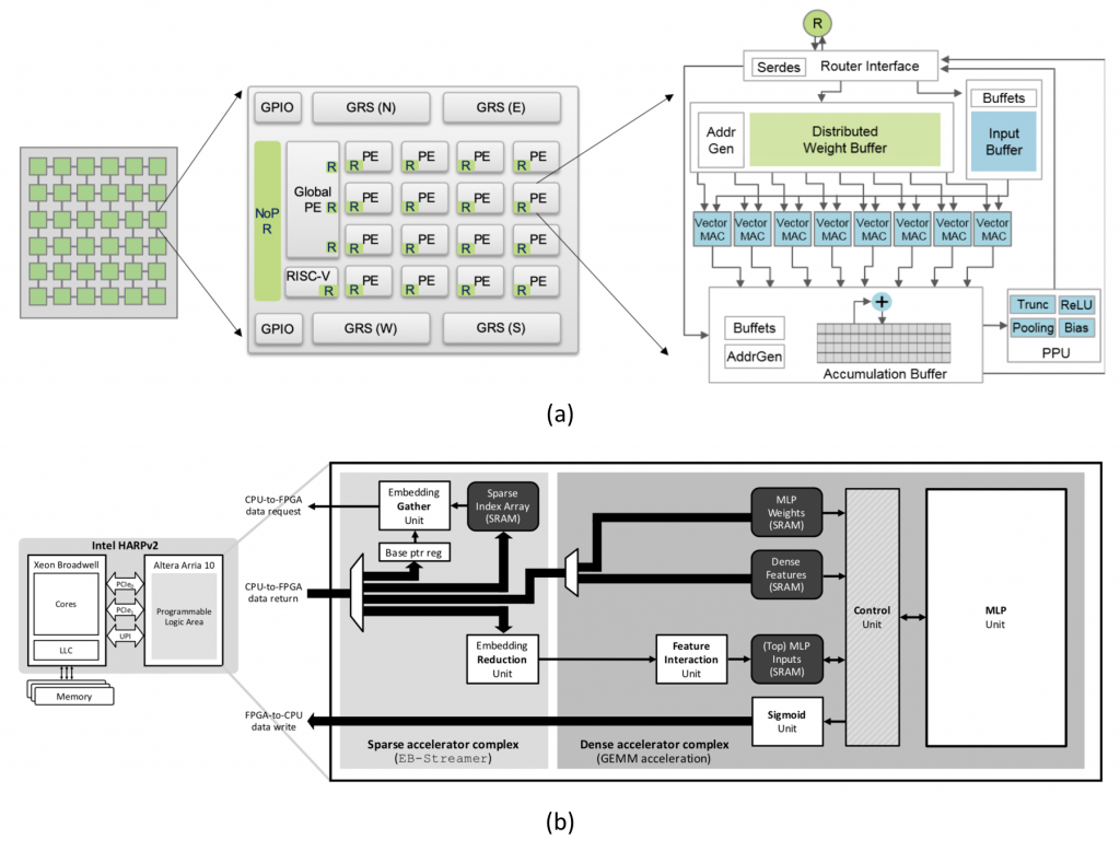 Figure 3. Chiplet-based ML accelerators (a) employing a “homogeneous” set of NPU chiplets for computer vision inference (Shao et al., “Simba: Scaling Deep-Learning Inference with Multi-Chip-Module Based Architecture”, MICRO-2019), and (b) integrating “heterogeneous” CPU+FPGA chiplets for recommendation inference (Hwang et al., “Centaur: A Chiplet-based, Hybrid Sparse-Dense Accelerator for Personalized Recommendations”, ISCA-2020).