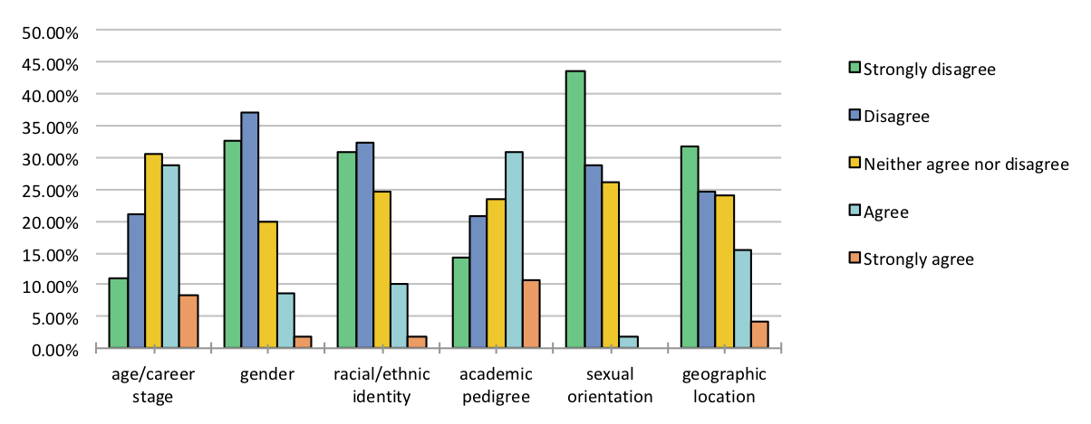 42% of respondents agreed or strongly agreed that their academic pedigree has negatively affected their participation in the community.  We have seen fairly clear bias towards certain academic institutions and lineages in some contexts, and these responses appear to be echoing that concern.