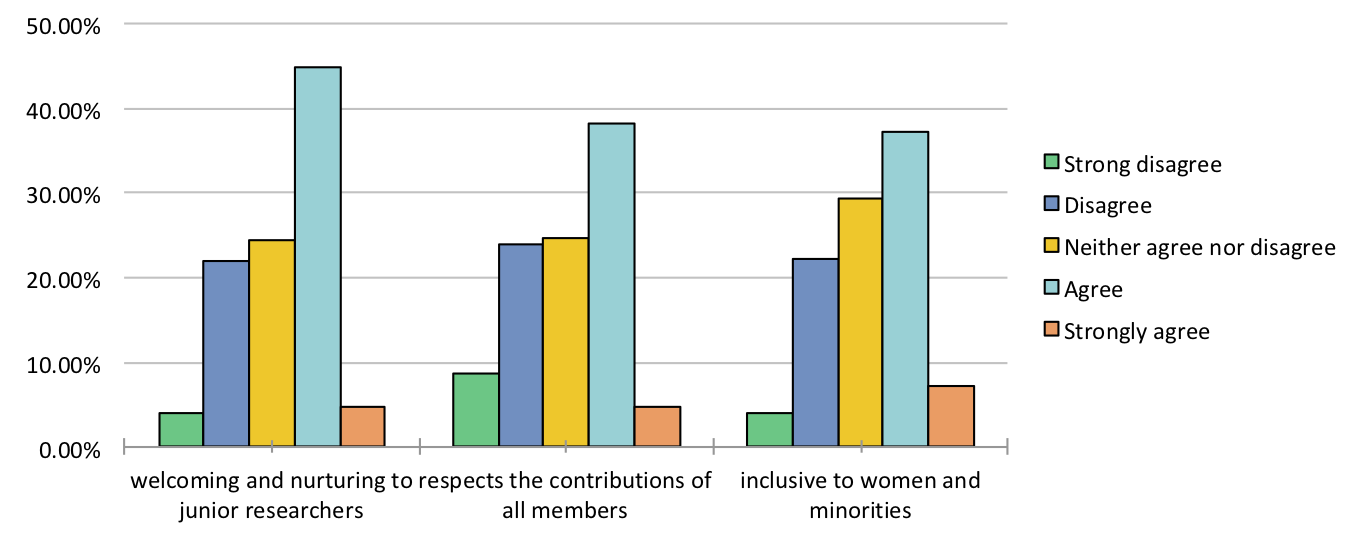 • 50% found the community supportive of junior researchers (agree or strongly agree) while 26% strongly disagreed or disagreed.