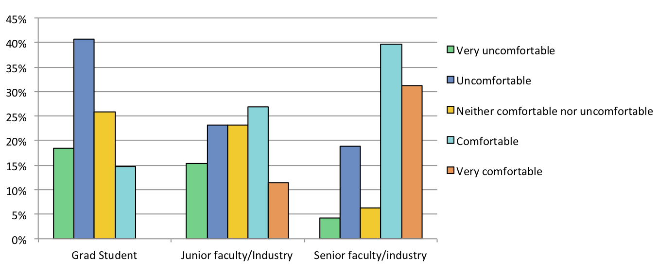 Figure 4 shows a breakdown of participants’ comfort level in approaching senior researchers by career stage. Not surprisingly, one’s comfort level in discussing research with senior members increases with seniority.  What was surprising was that a sizable fraction (23%) of senior members were uncomfortable or very uncomfortable approaching other senior members. Some free-form comments point to a degree of cliquishness that could be a contributing factor.  Breaking this question down by gender, 60% of women were uncomfortable or very uncomfortable compared to only 28% of men. This large disparity suggests that women might not be engaging as fully in community discussions as their male colleagues due to comfort level.  The perception of senior members being unapproachable may contribute to the lack of support felt by some junior researchers (Figure 3) but does not necessarily explain this gender imbalance. Given the importance of senior member support for career advancement, efforts to counteract this perception may improve individuals’ views of inclusiveness and encourage greater community engagement.