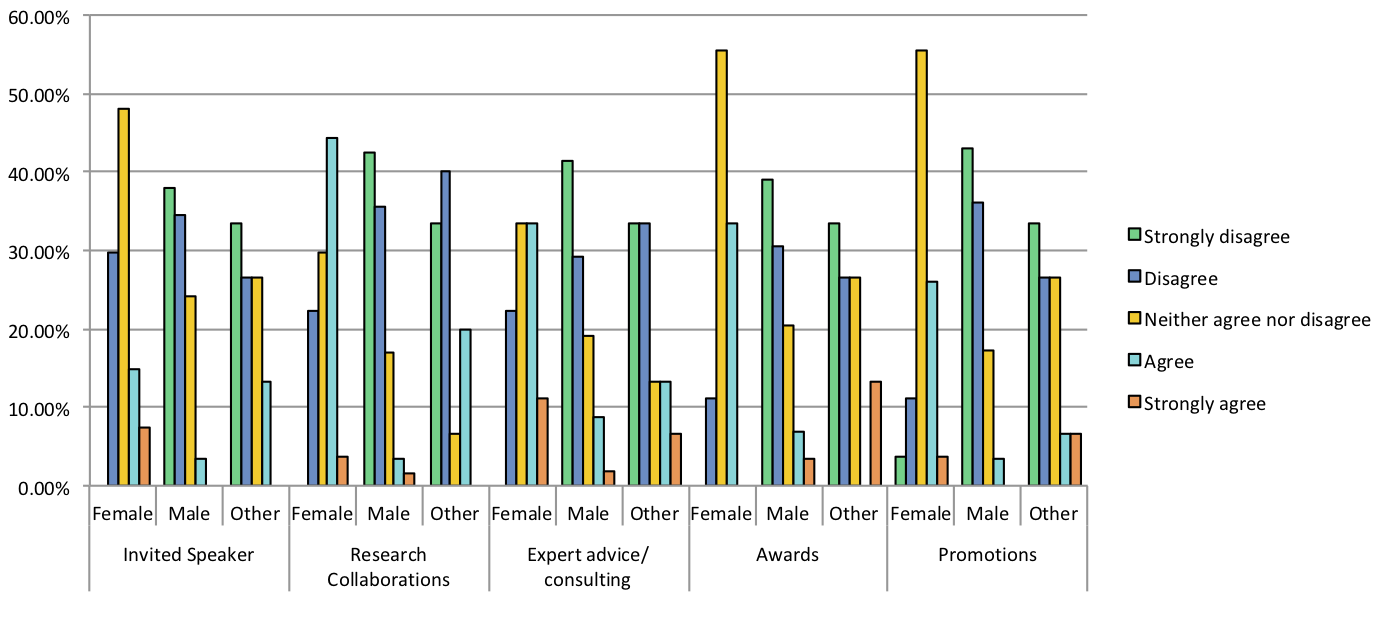 A larger fraction of women than men perceive that their gender has played a factor in their access to various career advancement opportunities (Figure 5).  48% of women agreed or strongly agreed that their gender held them back from research collaborations compared to only 6% of men. 33% of women agreed or strongly agreed that their gender has held them back from awards compared to just 9% of men.  Other forms of discrimination related to race, ethnicity, and religion are perceived to hold men back from these career-enhancing opportunities. It’s important to recognize that it is difficult to render an objective decision on merit. Most of us don’t intend to discriminate, but we all carry with us subtle and unconscious biases in how we evaluate and treat others.  For example, gender bias may result in “overly scrutinizing women’s work, questioning women’s research contributions, differences in recommendation levels and differences in visibility and social network”.1