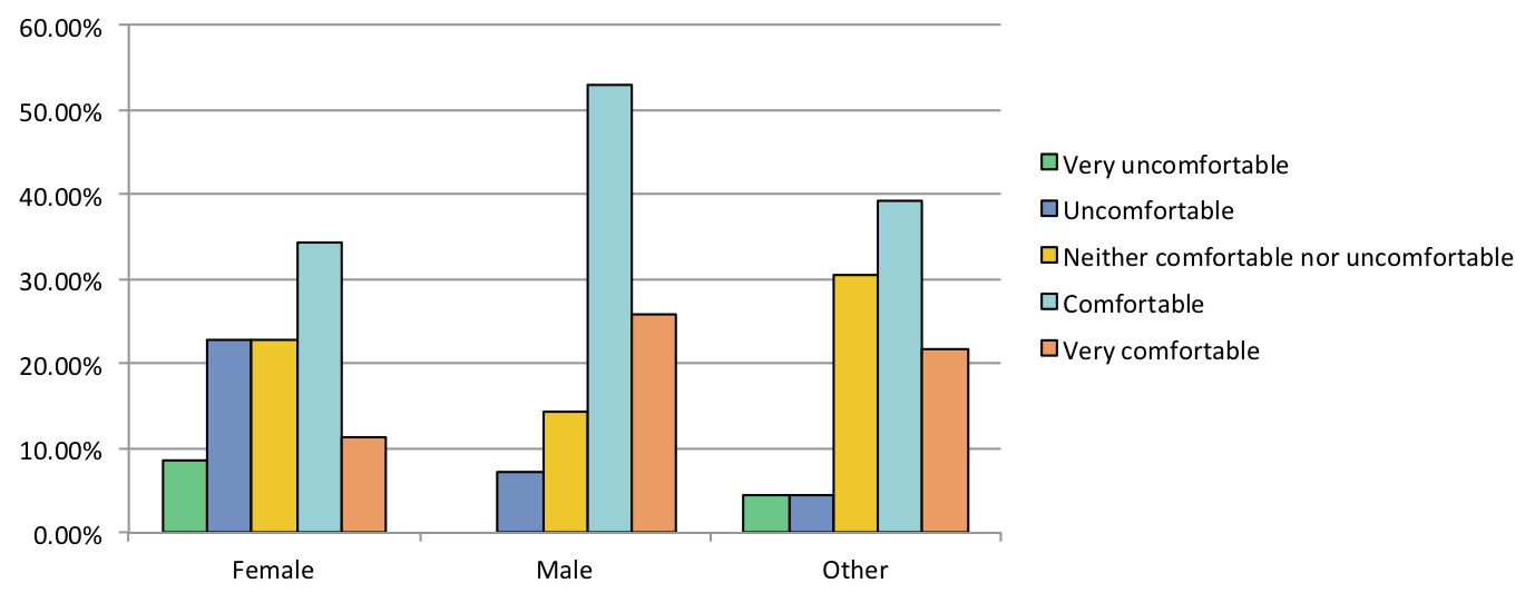 Figure 6: How comfortable are you joining after-hours networking/social activities with other conference attendees? (Respondents: Female (35); Male (70); Other (23) which includes “other”, “prefer not to say” and those who skipped the gender question).