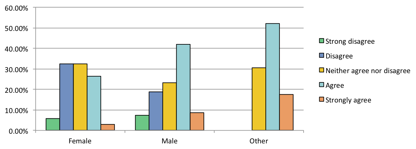 Men perceive less harassment and inappropriate behaviour in our community compared to women (Figure 7). 29% of women agreed or strongly agreed with this statement compared to 52% of men. This result would support the anecdotal evidence that women experience the community in a much different way than men. Kathryn McKinley’s blog post was hopefully eye-opening (i.e., these numbers may have been even more extreme had the survey been taken before that blog post was published), but the difference in responses is still notable.