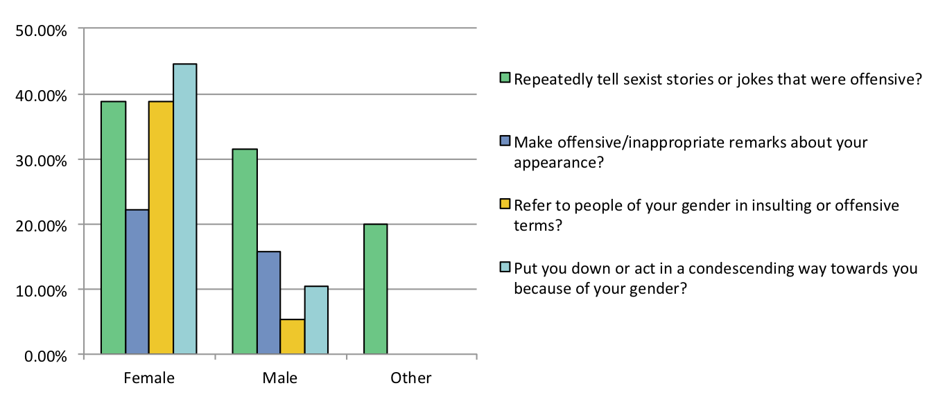 While almost half of respondents agreed or strongly agreed that they were able to speak their mind, felt valued, and felt listened to, roughly 25% of our community disagreed or strongly disagreed (Figure 1).  Broken down by gender, only 36% of women agreed or strongly agreed that they felt “valued” by the community although 58% agreed or strongly agreed that they were respected. There is a missed opportunity here to demonstrate that our community values the contributions of all members, male and female. We look to other survey questions to determine why these negative perceptions may exist.