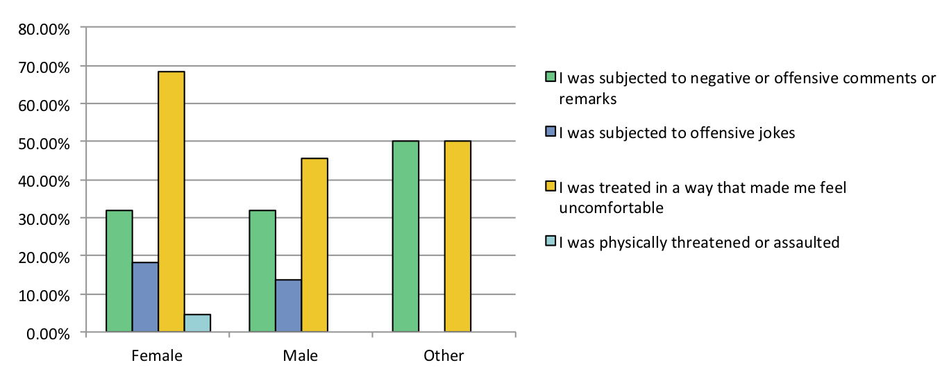 Figure 9: Considering computer architecture conference and meetings you have attended, have you experienced any of the following behaviour? (Other includes “other”, “prefer not to say” and respondents who skipped the question of gender.)