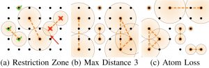 Figure: (a) Interactions of various distances are permitted up to a maximum. Gates can occur in parallel if their zones do not intersect. (b) The maximum interaction distance specifies which physical qubits can interact. (c) Neutral atom systems are prone to sporadic atom loss. Efficient adaptation to this loss reduces computation overhead.