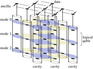 Figure: A fault-tolerant 2.5D architecture with random-access memory local to each transmon storing logical qubits (shown as checkerboards) spread across many cavities to enable efficient computation.