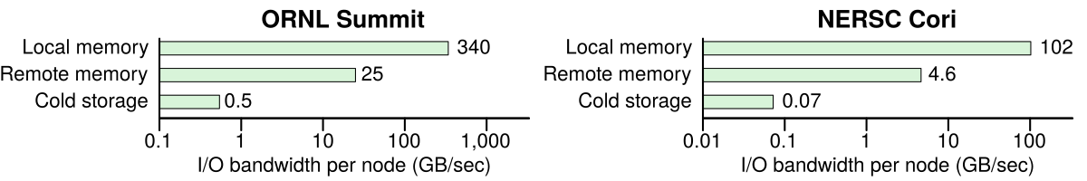 Many scientific applications are increasingly becoming I/O bound, as the bandwidth to cold storage is 50× – 1,500× less than the bandwidth to memory. Per-node bandwidth is shown for Summit and Cori, #1 and #13 computers in TOP500, respectively. Data from Vazhkudai et al. and NERSC.
