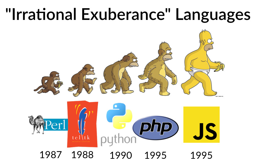 But a lot of programming these days is done in what I’ll call the irrational exuberance languages of the late 1980s and early 90s, a time when it seemed like performance was going to get better forever, before Dennard scaling collapsed. Some of these so-called “scripting languages” are essentially moribund, like Perl (1987) and Tcl/Tk (1988), but many have become incredibly popular, like Python (1990), R (1993), JavaScript (1995), and PHP (also 1995). In fact, according to Stack Overflow’s annual developer survey, JavaScript and Python are now the #1 and #2 most used programming languages, respectively (excluding HTML/CSS and SQL as “programming languages”).