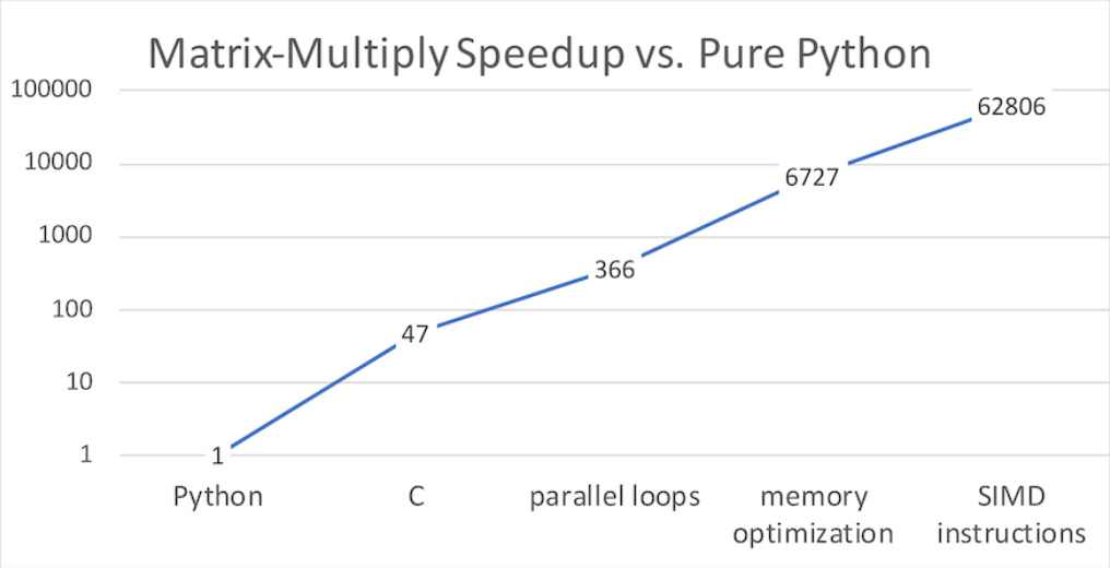 The execution time story is even worse. As Leiserson et al. have pointed out in their recent Science article (“There’s plenty of room at the Top”) — and cited by Hennessy in his Turing lecture — a naive implementation of matrix-matrix multiply in Python runs between 100x and 60,000x slower than their counterparts written in a “metal” language (highly optimized C).