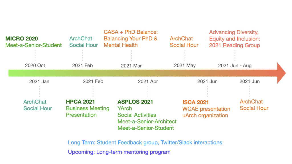 CASA’s establishment did not occur overnight—it was the result of almost a year of planning, community outreach, discussions, and exploration among a group of dedicated students and supporters. For me, it all originally began as a fleeting idea while attending ISCA 2019. Initially, I imagined an affinity group focusing on students from historically marginalized or disadvantaged (e.g. first-generation, BIPOC, LGBTQ+, and disabled) backgrounds. However, with the murmurs of a great tragedy in the community and a later chance meeting with future co-founder Raghavendra (Raghav) Pothukuchi at MICRO 2019, the concept of the group evolved toward one for any and all students in computer architecture who seek a support system.