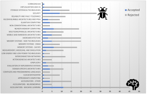 MICRO had an exceptionally strong program this year, thanks to the tremendous efforts put together by the program co-chairs Tor Aamodt and Reetuparna Das. 79 papers were accepted out of 344 submissions. In particular, the “Accelerators – Machine Learning” and “Security” topics, three sessions for each topic at MICRO this year, have the highest number of submissions: 45 and 28, respectively. The chairs also highlighted that 50% of papers with the primary topic in “Evaluation of Implemented Systems” were accepted, indicating an increasing focus on hardware prototyping and measured results in the computer architecture community. The “Mobile and Embedded Architectures” topic also has a 50% acceptance rate, followed by “Quantum Computing” with a 40% acceptance rate. You can see a detailed breakdown of the paper submissions below: