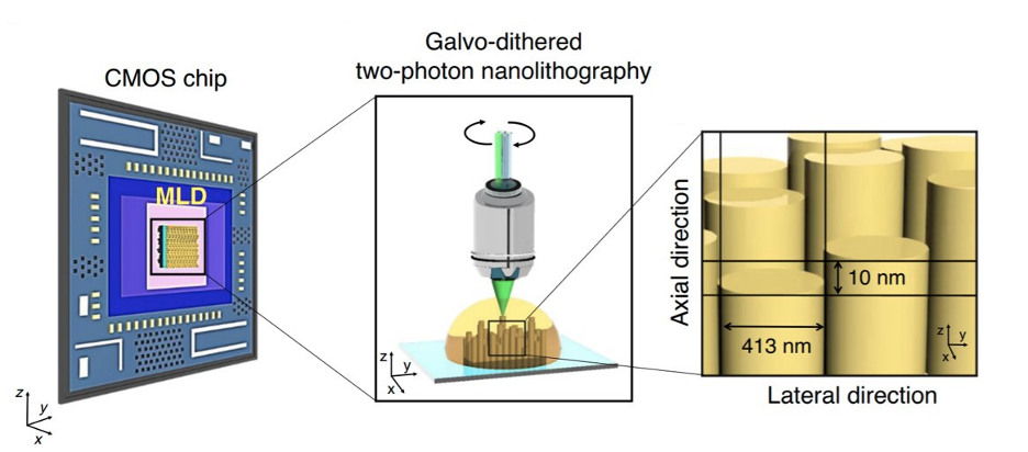 Nano-printing Approach. In the previous blog post, we briefed an 8 cm2 polymer wafer with patterns based on pre-trained weights. However, 8cm2 is a high area overhead cost to pay in comparison to nanoscale electronic counterparts. Recent work has attempted nano-printing of optical elements on CMOS wafers. One such work proposes compact optical decryptors for both symmetric and asymmetric decryption that are CMOS compatible. Decryptors are perceptrons trained to classify either a single or multiple classes of input secret images. Based on the perceptron model, optical elements are printed on top of a CMOS wafer such that it allows for optoelectronic processing. Each perceptron is a 3-dimensional cylindrical optical element defined by radius and height. The height determines the phase modulation incurred by diffraction of the incoming light and translates to a weighted sum (perceptron operation). A single such structure is called a machine learning decryptor (MLD). A single diffractive layer consists of multiple such MLDs. An overview of GD-TPN for MLD printing is shown below.