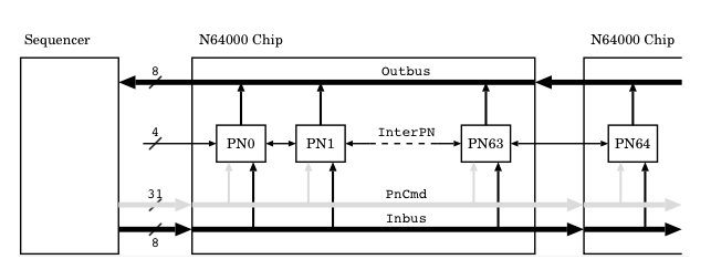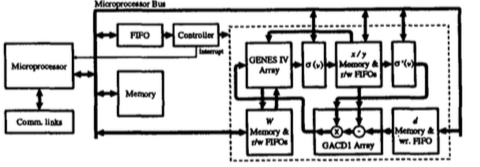 Let us take a closer look at one of these machines: MANTRA I by Swiss Federal Institute of Technology. MANTRA I was a 2D array of up to 40×40 GENES IV systolic processors and a few auxiliary processors. The GENES chip (Generic Element for Neuro-Emulator Systolic arrays) consisted of bit-serial processing elements that performed matrix operations. Today neural accelerators share similar architectural features: systolic arrays and configurable precision.