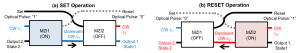 A general view of an optical flip flop is shown in Figure 1. The key operation of the optical flip-flop is based on the reconfigurability of an optical device called Mach–Zehnder interferometer (MZI). A typical MZI device can be set to steer light signals from one source to one or multiple destinations. As shown in Figure 1, two coupled MZIs form an optical flip-flop (MZI1 and MZI2). Each MZI is connected to an external source of continuous wave (CW) bias light with a specific wavelength (λ1 for MZI1 and λ2 for MZI2). Light pulses may be sent through the “Set” and “Reset” ports to change the flip-flop’s state. By sending a light pulse via the “Set” port, MZI1 is set to ON, thereby allowing its input CW signal (λ1) to travel from MZI1 to MZI2. This signal forces MZI2 to operate in its OFF state. In this state, MZI2 doesn’t allow its input CW signal (λ2) to travel between the two MZIs. In contrast, sending light pulses through the “Reset” port sets MZI2 to ON. As a result, MZI2 allows its input CW signal (λ2) to travel from MZI2 to MZI1. For each of these flip-flop states, the signal traveling between the two MZIs is called the dominant signal. By definition, the flip-flop represents a logical “1” if the dominant signal is λ1 and a logical “0” if the dominant signal is λ2. In other words, the two MZIs are used to send both CWs (λ1 and λ2) to either output 1 (logical “1”) or output 2 (logical “0”). As long as the continuous signals are fed to the flip-flop, the cell can retain the state of MZIs.