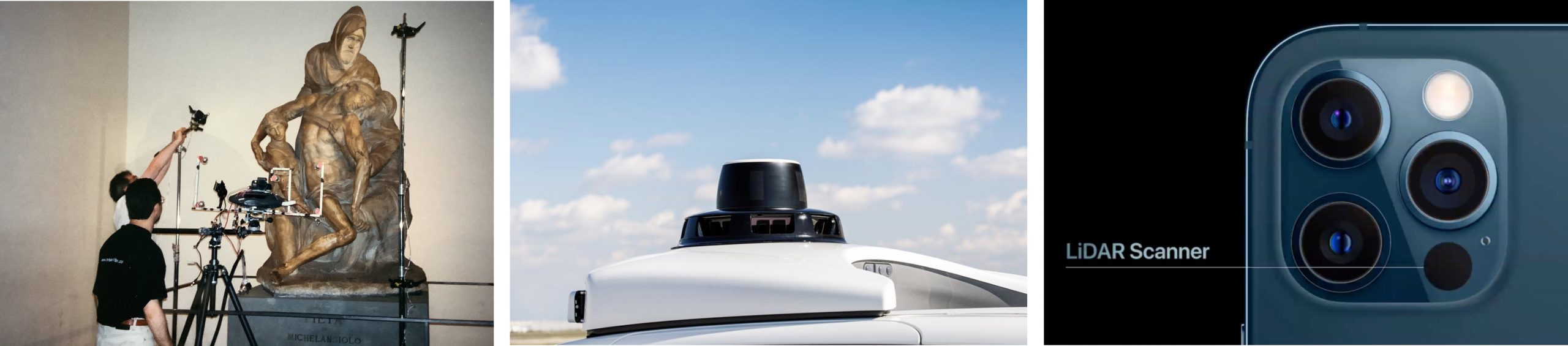 Figure 1: Different point cloud acquisition devices and use cases. (left) The structured light stereo system used to digitally model Michelangeloâs Florentine Pieta; (middle) LiDAR on Waymoâs self-driving car (source); (right) LiDAR on iPhone 12 Pro (source).