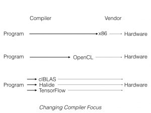 These observations have been made by many and there has been a blizzard of activity to tackle this. One historically typical response to hardware paradigm shifts is: invent a new language! Indeed, one of the most popular approaches has been  to develop  new domain specific languages. They promise  to better exploit application knowledge:  directly connecting users to hardware,  bypassing  the ISA. OpenCL is a great example of this. Hardware vendors can regularly change GPU ISAs under the hood without affecting user code – OpenCL is the new contract.