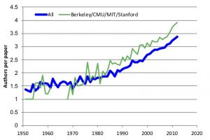 Figure 4. Average authors per paper increased from 1.5 in 1970 to 3.4 for the field in 2012. Authors per paper increased more, to 3.9, at four top U.S. departments.