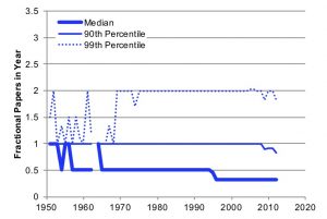 Figure 3. Weighted publications per year per author declined since 1970 for the 50th (median), 90th, and 99th percentile authors.