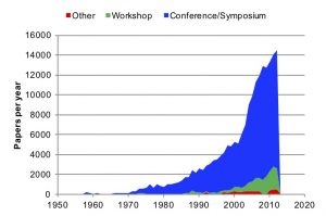 The number of computer science publications and researchers are growing exponentially. Figure 1 shows that computer science publications experienced exponential growth (9.3% per annum), doubling every eight years. Figure 2 shows that the number of computer science authors increased even more than publications. We distinguish established researchers, whose publications span five or more years (N=5), with authors of all papers, and authors with N=2 and 10. Authors grew 10.6% per annum, correlating with post-PhD participation in research publications.