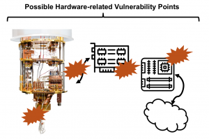 When considering the hardware, there are numerous security related question we can ask. Can programs, commonly referred to as circuits, running on qubits be protected from programs running on other quits? Can inputs and outputs of programs be isolated? Are there ways to protect the hardware so that it cannot be reverse engineered? Is it possible to reverse engineer a cloud-based quantum computer by running various quantum circuits, and if so, are protections possible? What physical attacks are possible to disturb operation of quantum computers, or to leak information from them? To answer these questions, we can analyze different parts of quantum computers and their architectures. Especially, beyond the qubits themselves, the architectures are actually composed of many other components. Many of which are classical: servers used to manage and schedule the jobs executing on the quantum computers, controllers (often built form FPGAs) used to interface with the qubits, and the actual fridges (in the case of superconducting qubit machines) wherein the qubits are located. Current research is only beginning to explore the security of all these parts, but already it is showing that qubits may not be immune to crosstalk attacks, or that outputs or resulting state of one circuit may leak across resets to the next circuit.