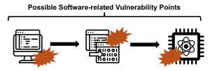 When considering the software (i.e. programs or circuits), there are numerous security related question we can also ask. Is there a way to detect or prevent a user from running certain algorithms on a cloud-based quantum computer? What are the cybersecurity threats that are different between classical and quantum computing systems? To answer these questions, we can analyze different parts of the software development and the software stack of quantum computers. Many of the parts are quite analogous to classical computers. There is the input program (or circuit) described, for example, using Python-based Qiskit framework. The input gets complied into, eventually, set of control pulses to be executed on the quantum computer, and there is runtime that actually issues the pulses to the hardware. At each point, the input, compiler, or runtime, malicious code could be trying to compromise the system. Already, research has shown ways to implement some simple viruses which can execute on the quantum computers.