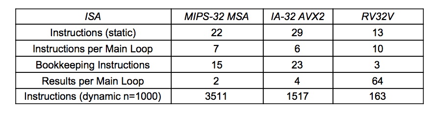 We think the high contrast in cost-energy-performance, complexity, and ease of programming between the vector approach of RV32V versus the ever expanding SIMD architectures of ARMv7, MIPS-32, and IA-32 is one of the most persuasive argument for RISC-V.