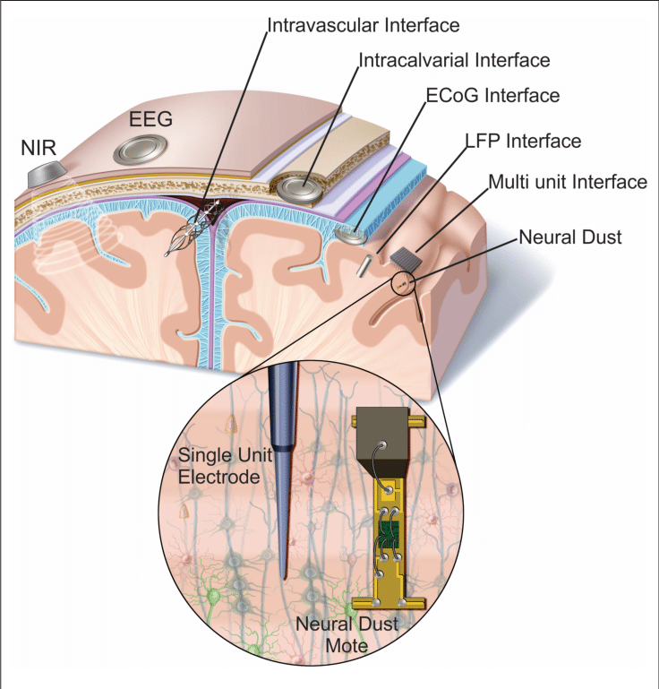 Different modalities of sensing neural activity in the brain, shown with a cross-section of the skull and the brain. The topmost layer is the scalp. Near Infrared (NIR) and electroencephalography (EEG) are wearable methods while the others including electrocorticography (ECoG) and local field potential (LFP) interfaces require surgery. Picture credit: [3].