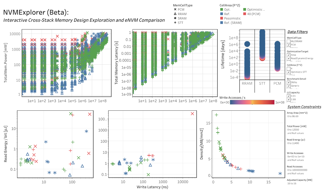 To address the design space problem of NVMs, our team of researchers at Harvard University and Tufts University developed open source software and an interactive web tool for conducting design space exploration of NVMsâcalled NVMExplorer (published at HPCA â22). In the spirit of co-design, we take a cross-stack approach which enables users to compare the application-level impacts of different NVM technologies under different system architectures.Â