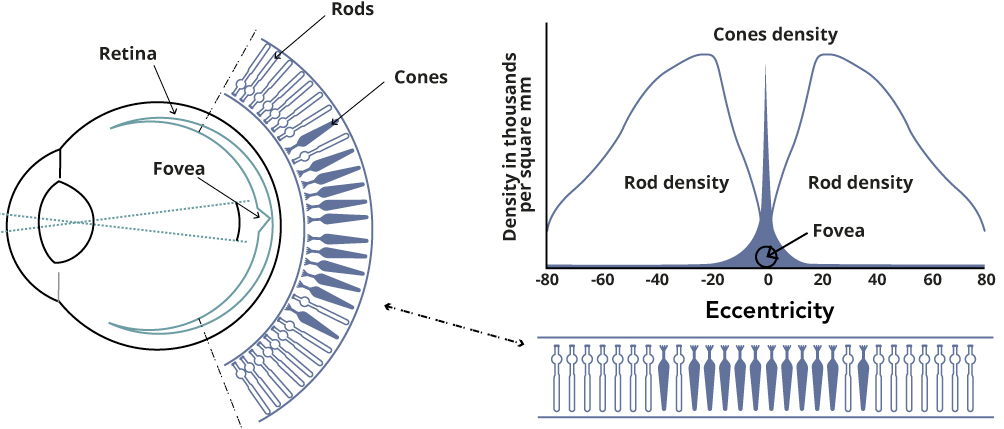 Our peripheral visual acuity is extremely bad. If you fixate straight ahead, you won’t be able to tell the details of an object in your peripheral vision. The fundamental reason is well-known: photoreceptor cell distribution is extremely non-uniform on our retina. Anatomical data show that more than 95% of the photoreceptor cells lie in the central region of the retina, called the fovea, where we say the eccentricity is 0°. As soon as we move beyond the fovea, i.e., the eccentricity increases, the density of photoreceptors drops sharply. See Figure 2.