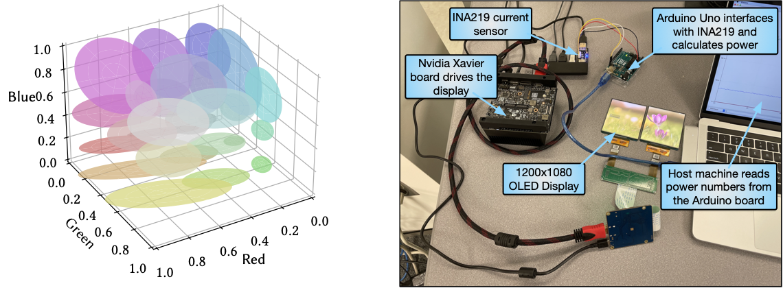 Why do we care about color? It turns out that the OLED display power is dictated by color (and brightness of course); some excellent examples that came to mind are Crayon, Into the wild, Chameleon, and a recent work by Dash and Hu. At the extremes, black means no light is emitted from the sub-pixels and consumes no power, whereas white requires all the sub-pixels to emit max amount of light and consumes the highest power. Hardware measurements (see Figure 3 right) allow us to build another computational model, this time to model the total display power as a function of color (the R, G, B values).