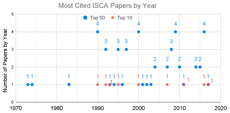 Finally, I looked at how Top 10 and Top 50 citations change over time. The histogram below plots the number of cited papers by year of the conference. It takes a few years after a paper is published before it can attract 1000+ citations, so it’s not shocking that the newest highly cited paper is from 2017.