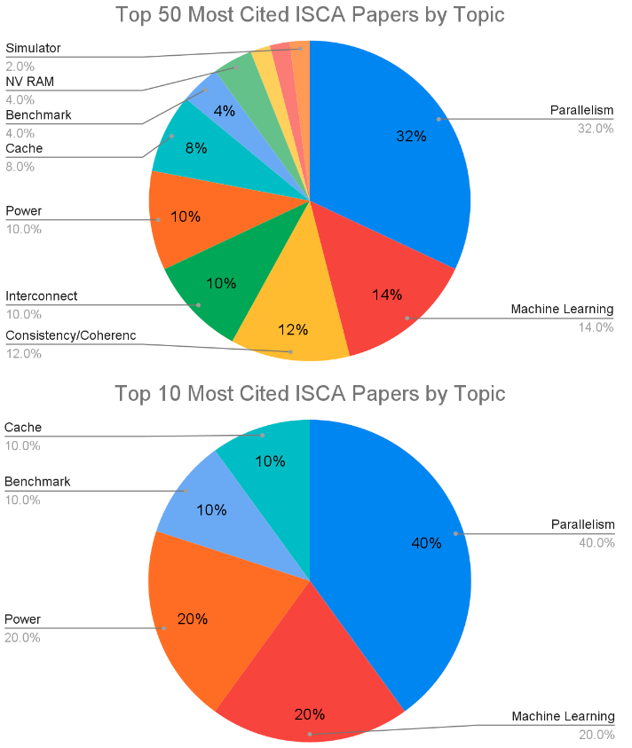 The architecture topics in the pie charts below are hopefully self-explanatory. As the chip design mantra today is power-performance-area, it is no surprise that parallelism and power are large slices. Machine learning (ML) accelerators have an unexpectedly large slice of the top 10 and of all 50, since the current excitement about deep neural networks started only a decade ago—the 9 ML papers in the table are from 2014 to 2017. ML papers in general are among the most highly cited in all of science and engineering, e.g., the ResNet ML paper from 2016 has 161,000+ citations. Thus, the huge popularity of ML today likely accelerates citations to ML accelerators.