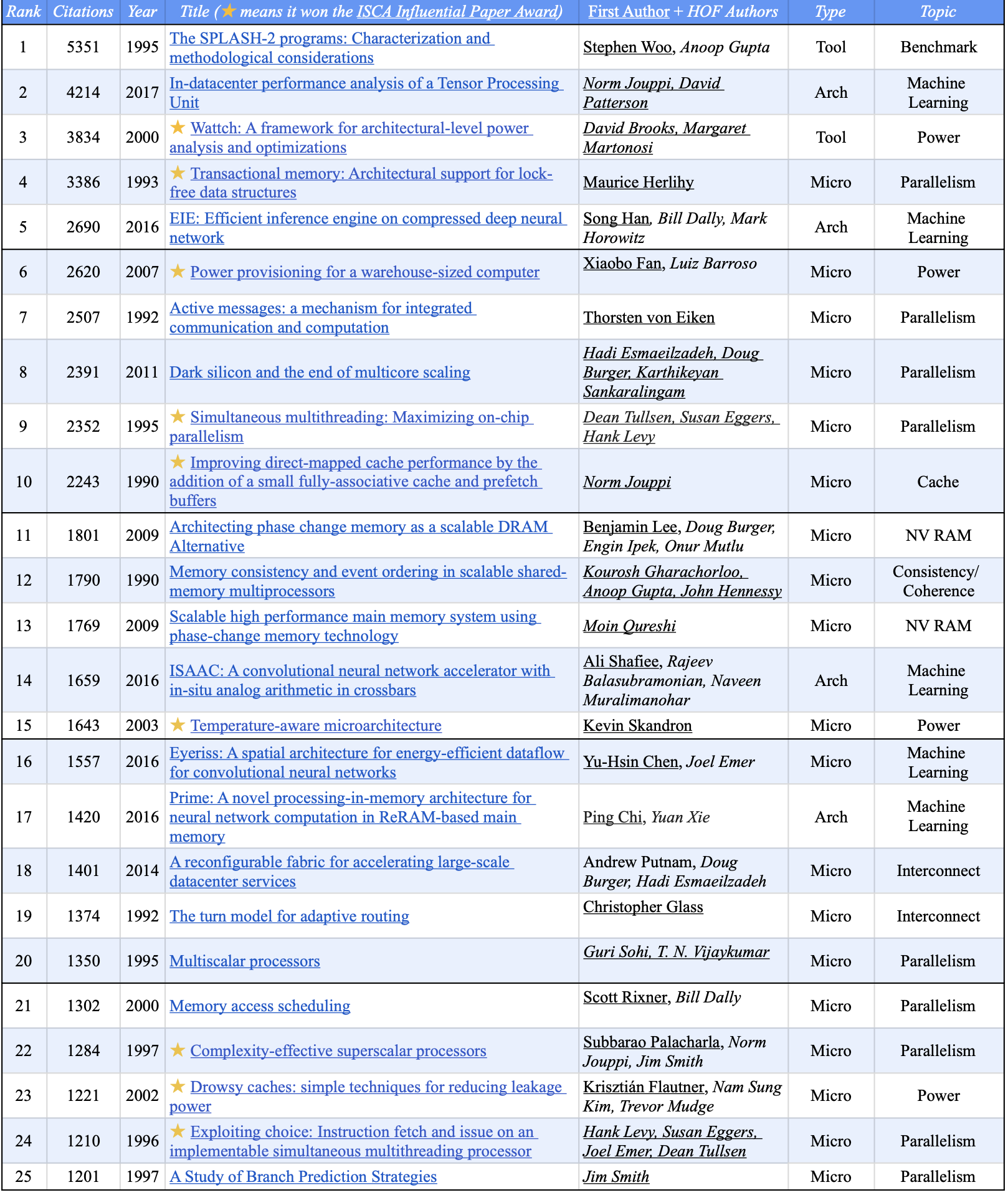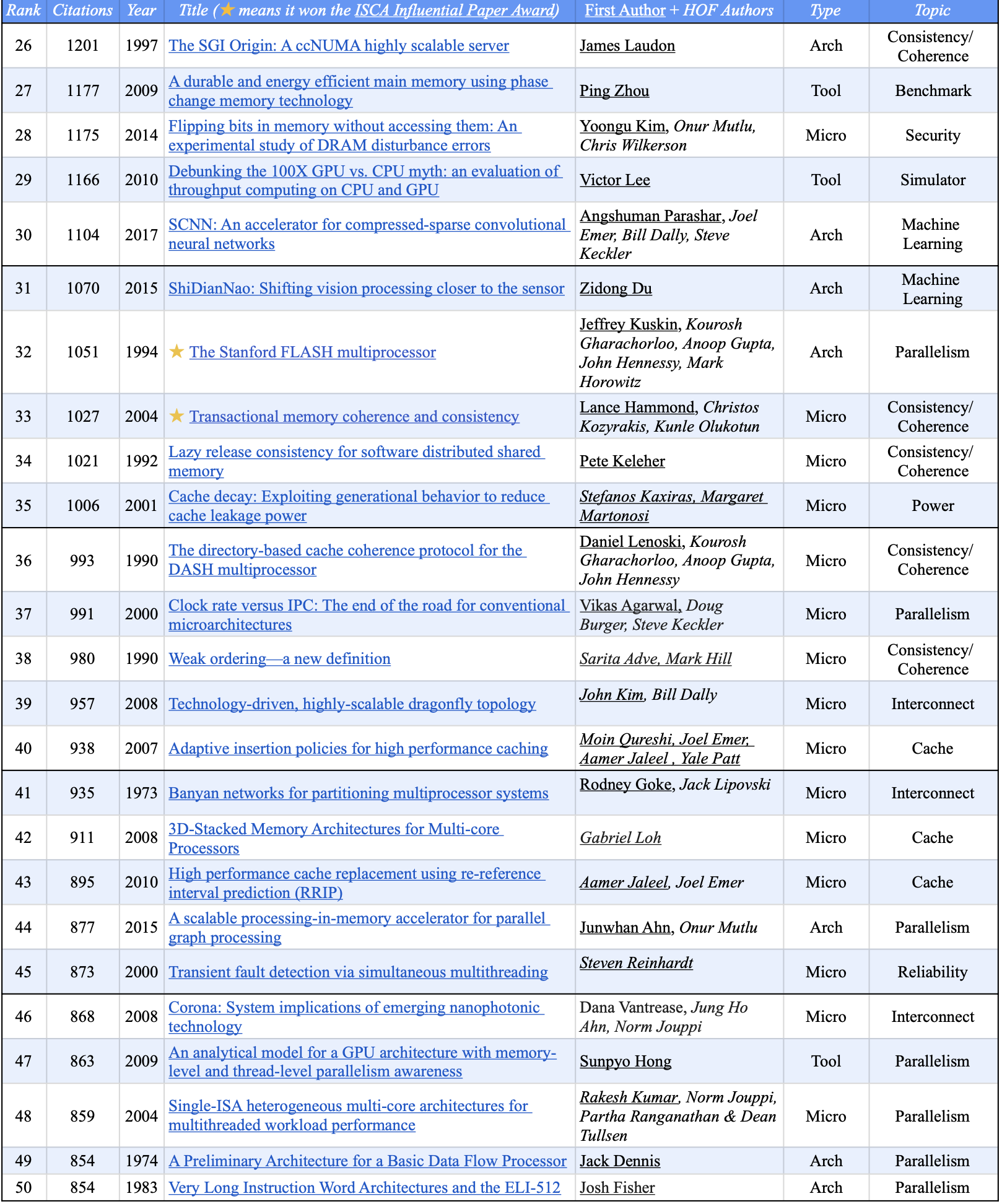 Nevertheless, it’s hard not to notice that Norm Jouppi—also at Google—won 2 Influential ISCA Paper Awards and co-authored 2 of the Top 10 and 5 of the list of 50. Others who co-authored several top 50 papers are Joel Emer (5), Bill Dally (4), Anoop Gupta (4), Doug Burger (4), Kourosh Gharachorloo (3), John Hennessy (3), Onur Mutlu (3), and Dean Tullsen (3). These 9 of the 125 ISCA HOF architects co-authored 20 of the Top 50 papers. Put another way, of the top 35 HOF authors (≥15 papers), only 10 have multiple Top 50 papers, 15 have one paper, and 10 have none.