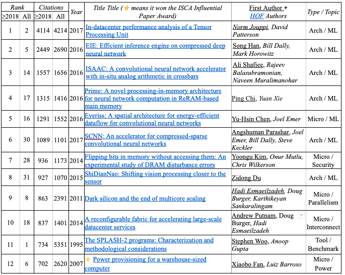 As one might expect, the ML accelerated papers dominate the most recently cited papers, occupying the first 7 slots and 9 of the 15. Sophia Shao noticed that unlike the Top 50, most were architectures, presumably because it is easier for small groups of researchers to design new domain specific architectures than general purpose ones. These papers are also more recent than the Top 50: their median year is 2014 versus 2003 for the Top 50. My colleague Cliff Young noted the staying power of the SPLASH-2 paper, which appeared 12 years before the next oldest paper. The top paper in Table 2 added ~1200 citations since January 2022 vs ~120 for the top paper in Table 1, so might become the highest cited next year.