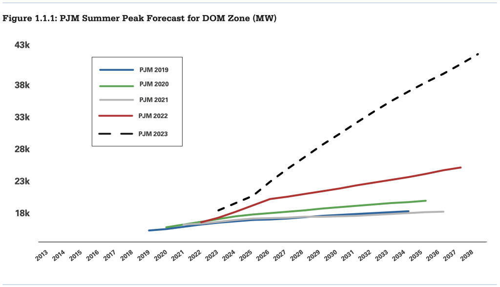 Figure 2. The rapid growth of Datacenters in Northern Virginia has required utilities to increase their future power needs estimates. For Dominion Energy the 2030 estimate has increase by 12GW in the short period from 2019 to 2023.